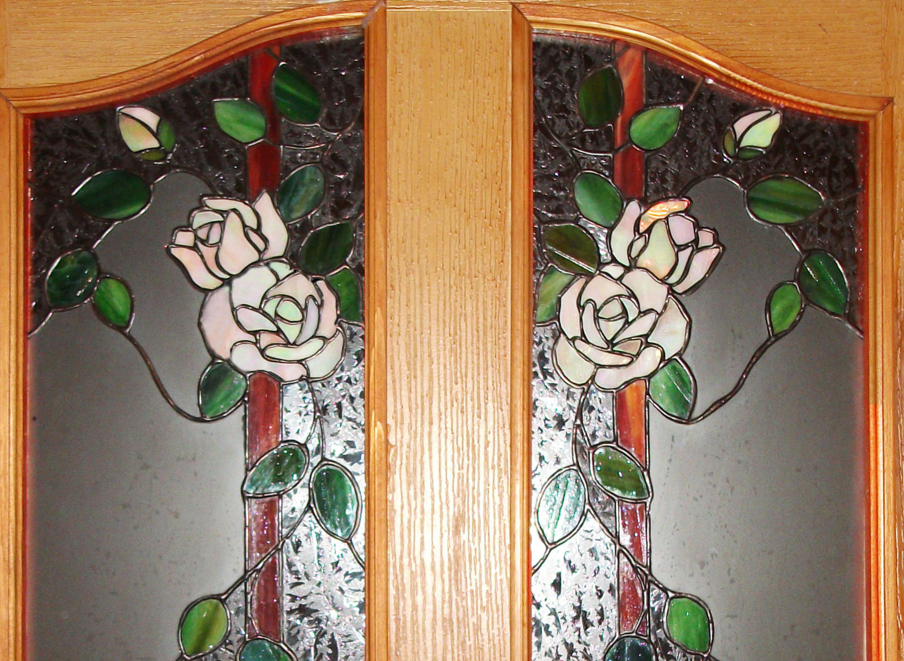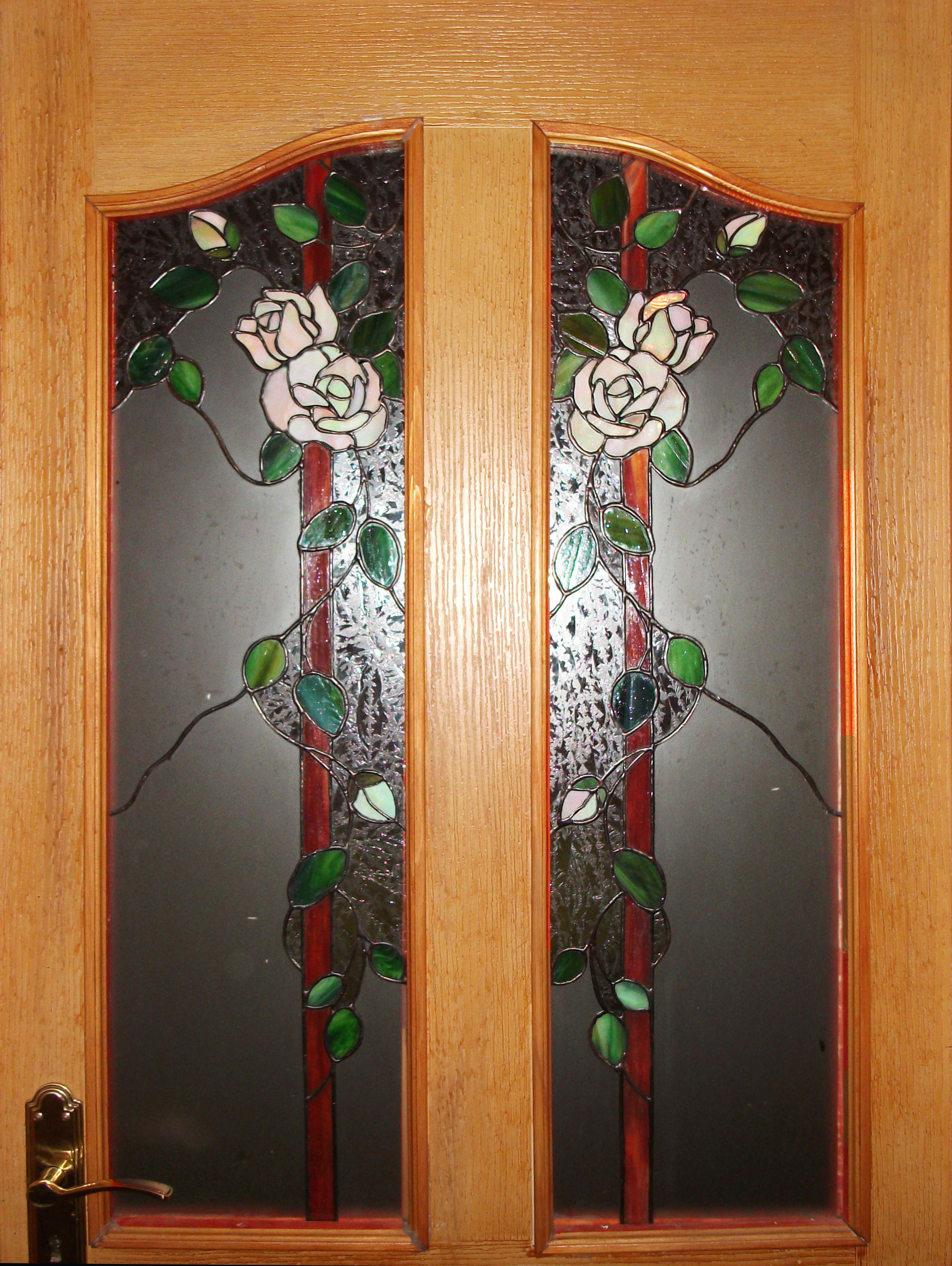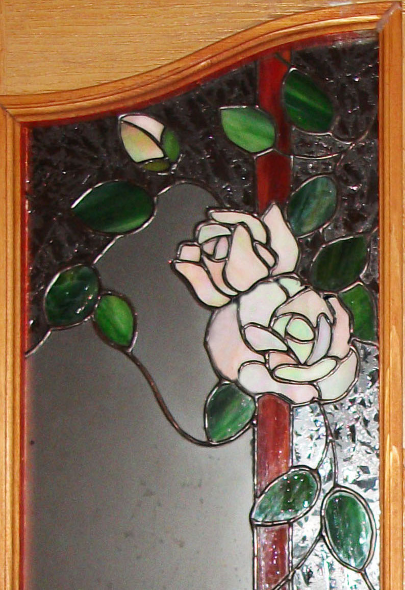 Rendelésre készült 4 db különböző színű rózsás ajtóbetétek egyike, irizált fehér, halvány bézs színű rózsákkal, szecessziós, egyedi tervezéssel és vonalvezetéssel. Háttérként savmaratott üveg és egy különleges jégvirág mintájú üveg fogja közre a színes szirmokat és finoman kapaszkodó leveleit.