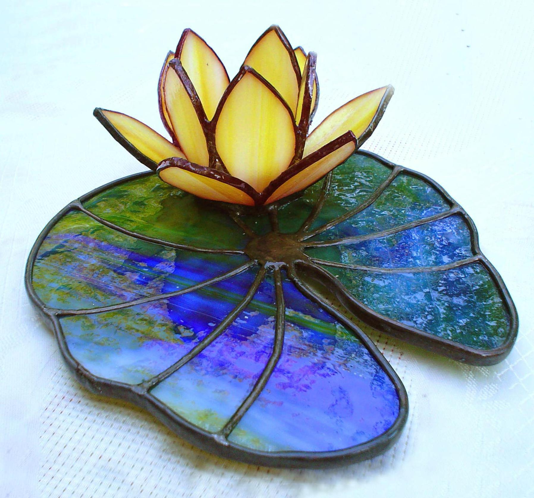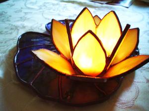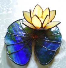 A lótusz nemcsak a tisztaságot és szépséget szimbolizálja, hanem az emberi lélek kibomlását. Azért is övezi olyan nagy tisztelet ezt a virágot, mert növekedésének és fejlődésének körülményei az ideális emberi életutat mutatják be: magja megtelepszik a folyó vagy tómeder alján, majd egy vékony inda indul el belőle, ami egésze a víz felszínéig tekereg, hogy végül a levegőre és napfényre érve kibontsa szirmait így tündöklését nem csak a világ, hanem az istenek is megcsodálhatják. Gyönyörűen átvilágítja a mécses ezt a szép színes üveget, hangulatos dekoráció. Kitűnő ajándék magadnak otthonodnak vagy ismerősödnek. Nagyon szépen mutat még egy asztal közepén vagy polcon, bárhol. Alul kis üveggyöngyök vannak. Lehet kérni irizált - szivárványos felületű üveggel, vagy bármilyen más színben is mind a szirmokat, mind a levelet illetőleg.