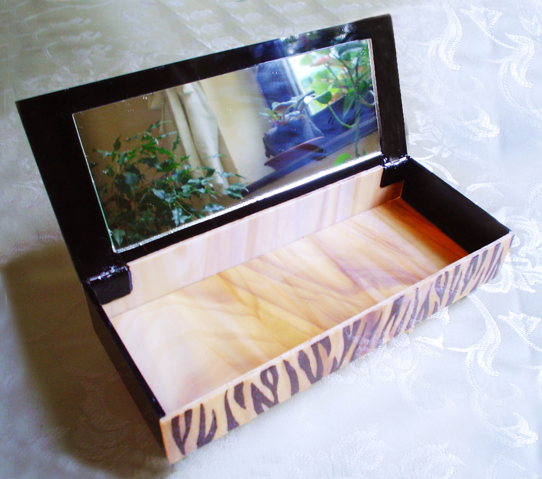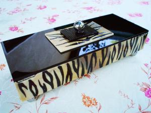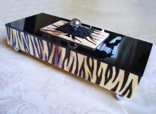Modern és elegáns ékszerdoboz hölgyeknek. Tetején és alján gyönyörű fémgolyók, csapágyak. Oldalán és tetején izgalmas tigriscsíkos mintázattal gazdagított ajándék különlegesség, amely szinte minden korosztály tetszését elnyeri. Ékszerek és kisebb értékek tárolására alkalmas, Bármely különleges alkalomra is fényűző egyedi meglepetés lehet. Zsanérral nyitható - zárható, a fedelén belül tükörrel, alul a felső gyönggyel azonos 4 lábbal ellátott. Belső elválasztó rekesszel, bársonyborítással és a fedelet tartó lánccal is kérhető, amely a nyitórész alsó felén helyezhető el.