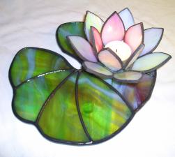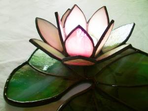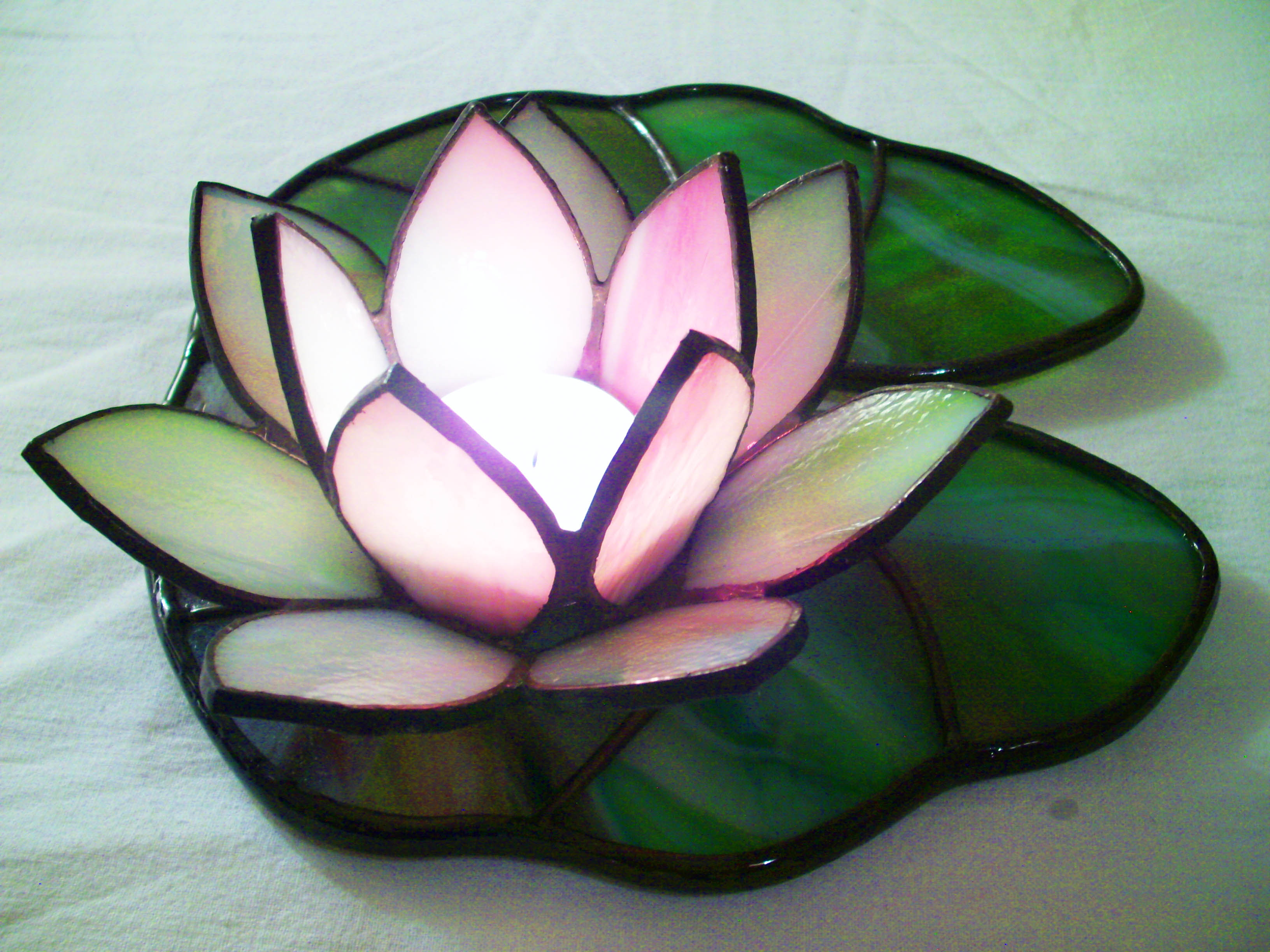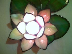 Finoman, enyhe rózsaszín és tavaszias színekkel tarkított szirmú tavirózsa mécsestartó egyedi színösszeállítású zöld levélen. Bármilyen alkalomra kiváló ajándék, színei révén mind nőknek, mind férfiaknak kitűnő ajándék.
