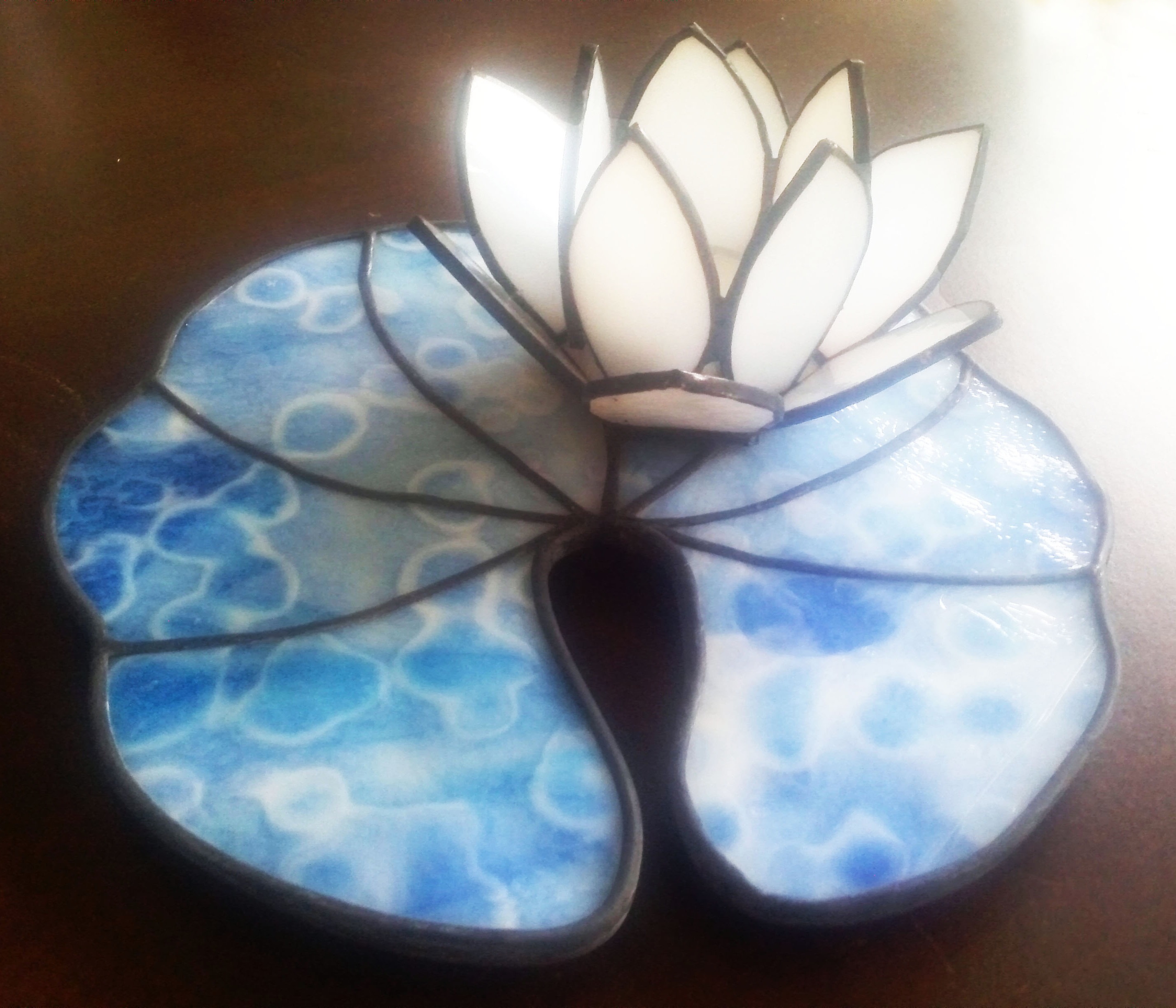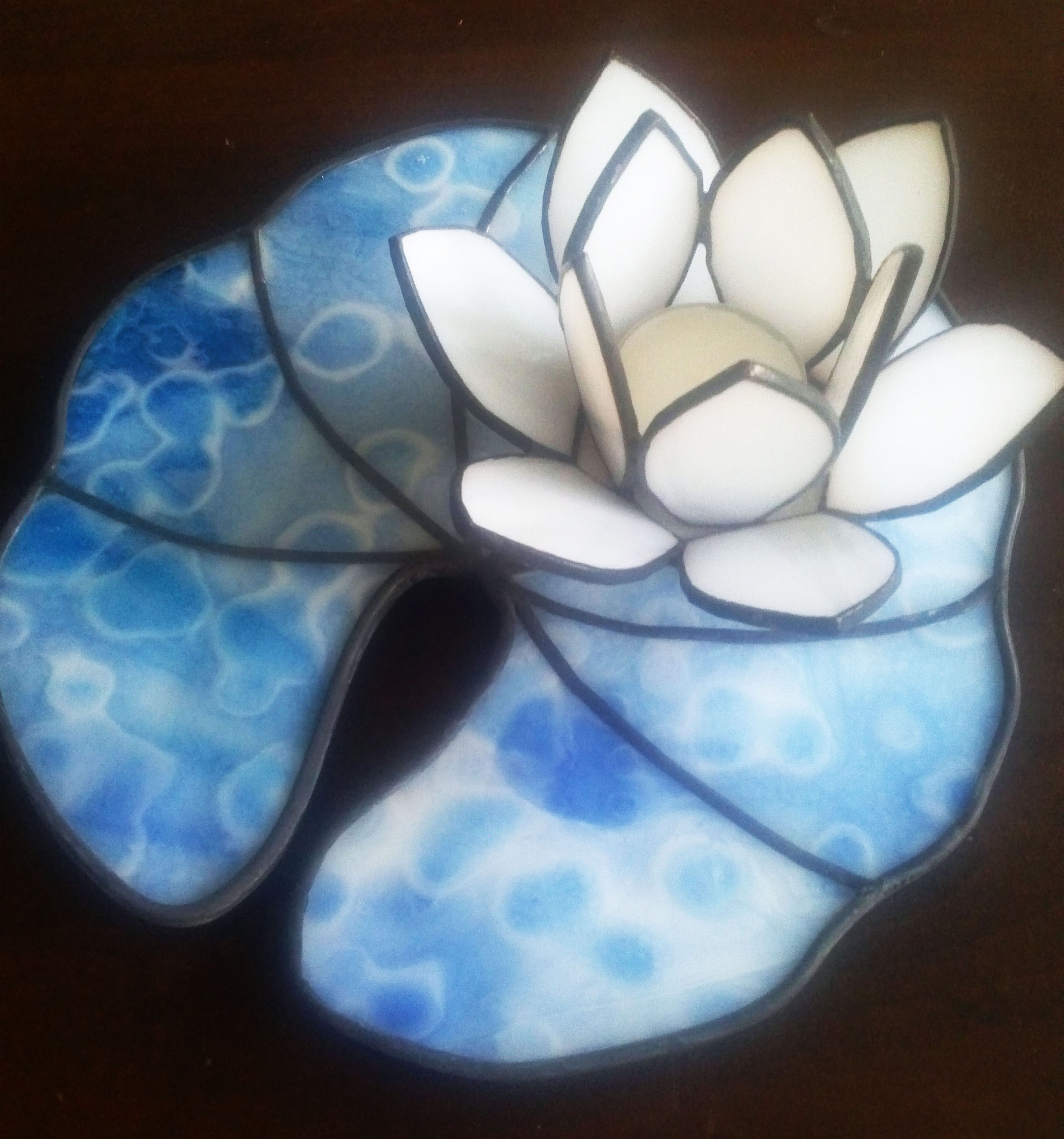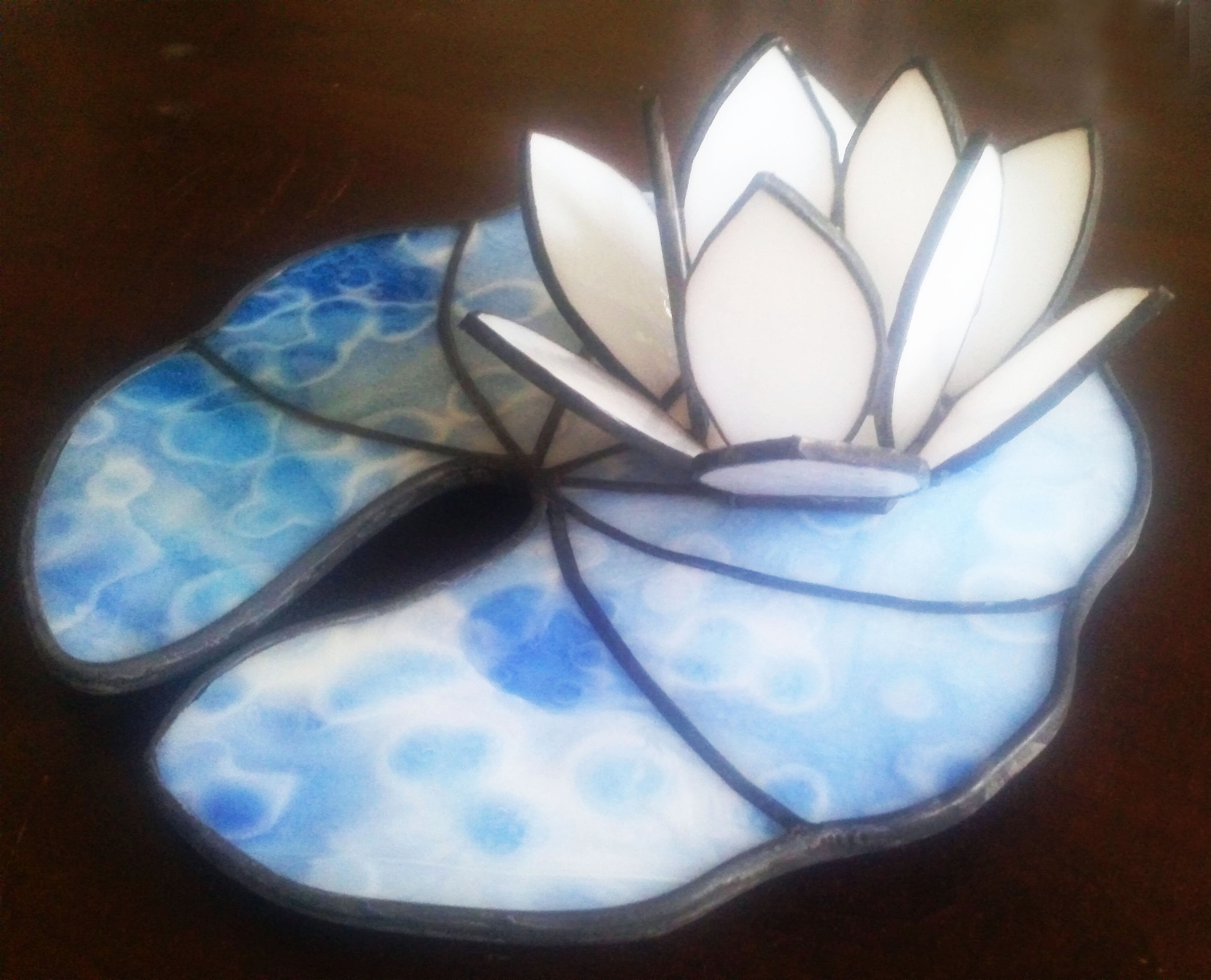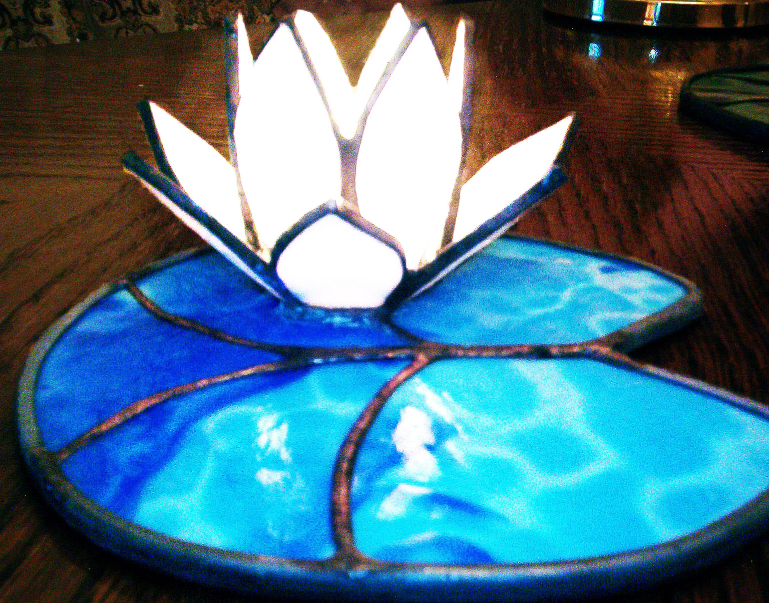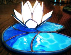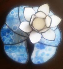 Gyönyörű lótuszvirág hófehér szirmokkal és izgalmas kék üveg-levélen. A lótusz nemcsak a tisztaságot és szépséget szimbolizálja, hanem az emberi lélek kibomlását. Azért is övezi olyan nagy tisztelet ezt a virágot, mert növekedésének és fejlődésének körülményei az ideális emberi életutat mutatják be: magja megtelepszik a folyó vagy tómeder alján, majd egy vékony inda indul el belőle, ami egésze a víz felszínéig tekereg, hogy végül a levegőre és napfényre érve kibontsa szirmait így tündöklését nem csak a világ, hanem az istenek is megcsodálhatják. Gyönyörűen átvilágítja a mécses ezt a szép színes üveget, hangulatos dekoráció. Kitűnő ajándék magadnak otthonodnak vagy ismerősödnek. Nagyon szépen mutat még egy asztal közepén vagy polcon, bárhol. Alul kis üveggyöngyök vannak. Lehet kérni irizált - szivárványos felületű üveggel, vagy bármilyen más színben is mind a szirmokat, mind a levelet illetőleg.