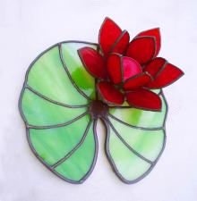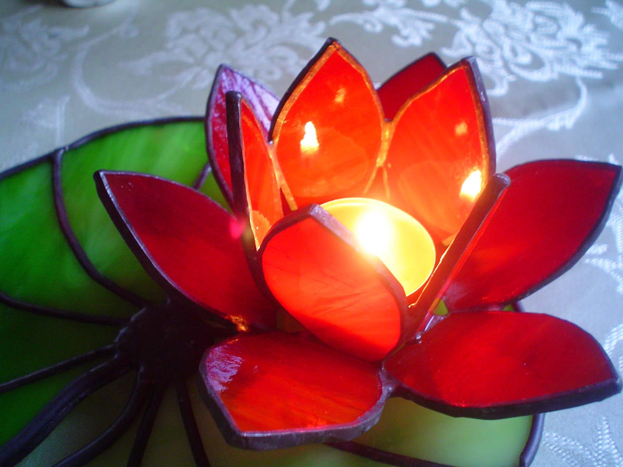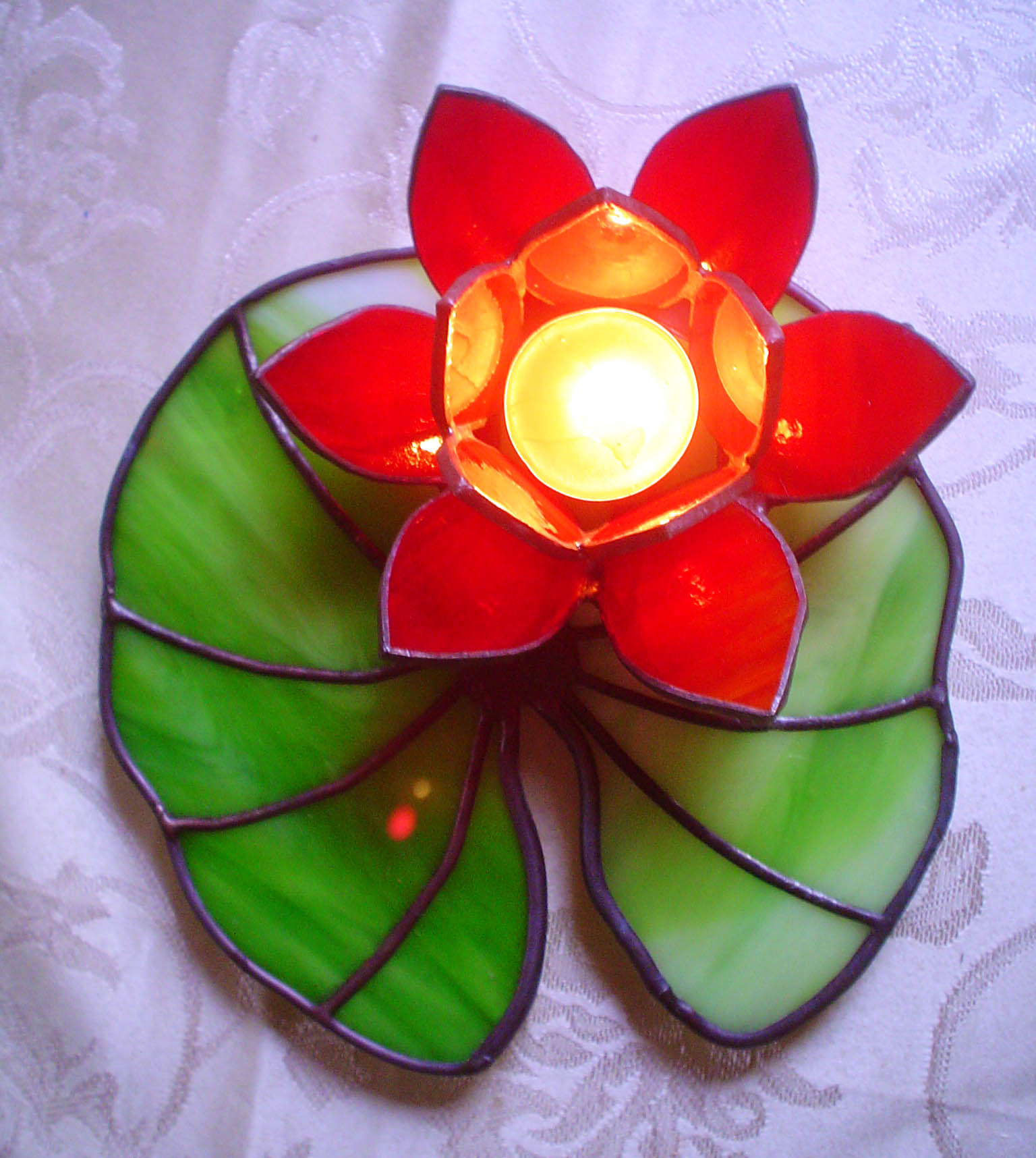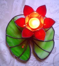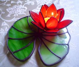 hullámos csillogó lakréteggel bevont világoszöld levélen. A lótusz nemcsak a tisztaságot és szépséget szimbolizálja, hanem az emberi lélek kibomlását. Azért is övezi olyan nagy tisztelet ezt a virágot, mert növekedésének és fejlődésének körülményei az ideális emberi életutat mutatják be: magja megtelepszik a folyó vagy tómeder alján, majd egy vékony inda indul el belőle, ami egésze a víz felszínéig tekereg, hogy végül a levegőre és napfényre érve kibontsa szirmait így tündöklését nem csak a világ, hanem az istenek is megcsodálhatják. Gyönyörűen átvilágítja a mécses ezt a szép színes üveget, hangulatos dekoráció. Kitűnő ajándék magadnak otthonodnak vagy ismerősödnek. Nagyon szépen mutat még egy asztal közepén vagy polcon, bárhol. Alul kis üveggyöngyök vannak. Lehet kérni irizált - szivárványos felületű üveggel, vagy bármilyen más színben is mind a szirmokat, mind a levelet illetőleg.