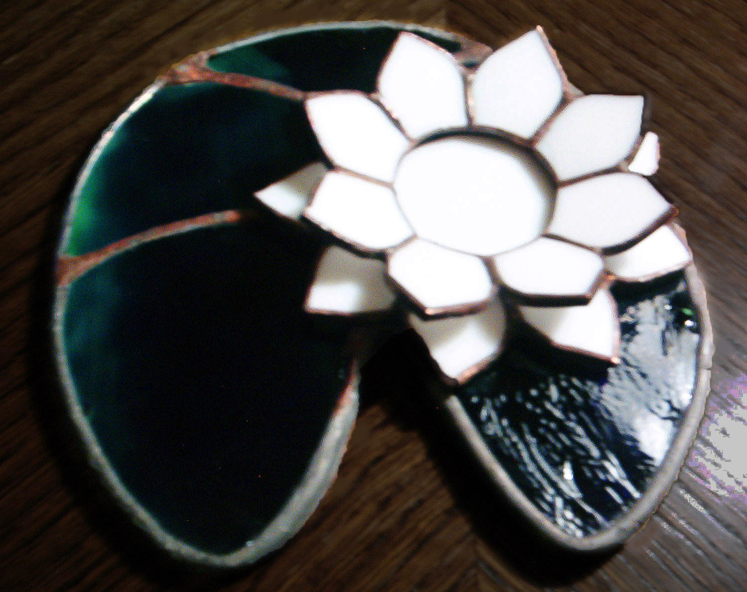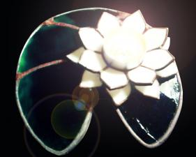 Gyönyörű tündérrózsa hófehér irizált szirmokkal élénkzöld, izgalmas felületű csillogó sötétzöld uroboros üveglevélen. Itt a mécsen nem világítja meg annyira a szirmokat, inkább egy kellemes alátétet biztosítanak neki Bármilyen színkombinációban és méretben rendelhető.