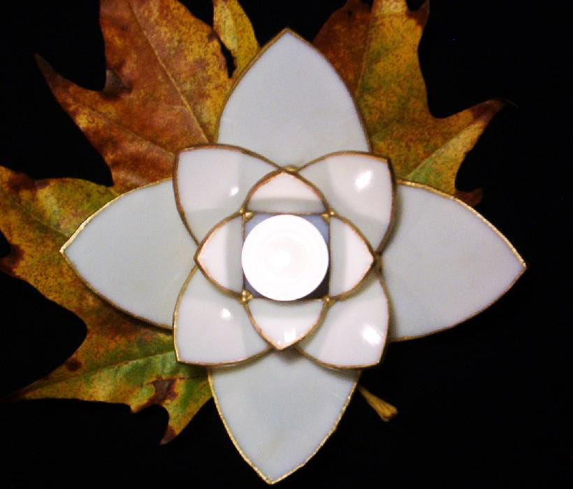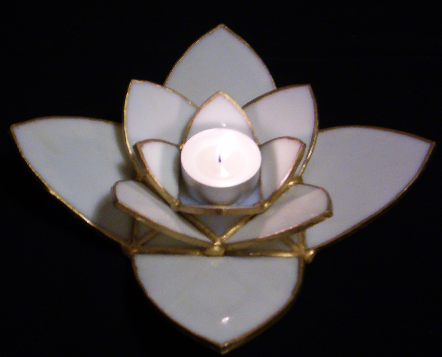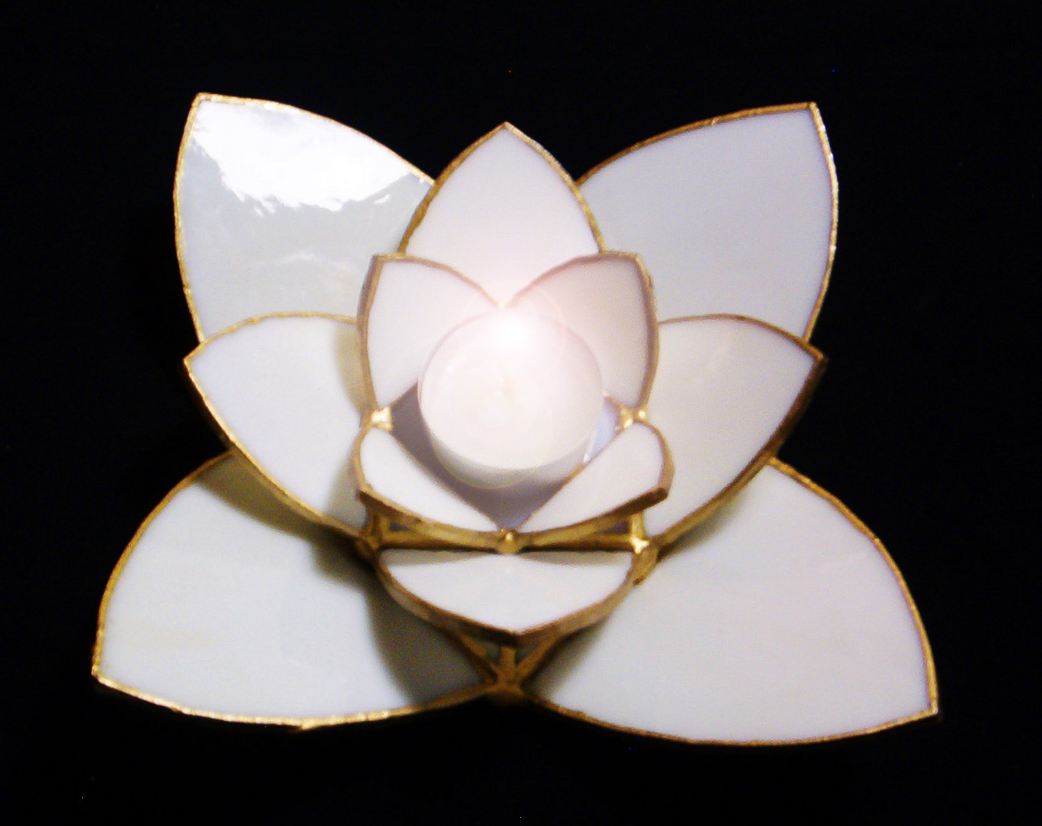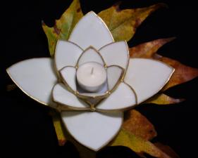Hófehér stilizált lótusz, ami nemcsak a tisztaságot és szépséget szimbolizálja, hanem az emberi lélek kibomlását. Azért is övezi olyan nagy tisztelet ezt a virágot, mert növekedésének és fejlődésének körülményei az ideális emberi életutat mutatják be: magja megtelepszik a folyó vagy tómeder alján, majd egy vékony inda indul el belőle, ami egésze a víz felszínéig tekereg, hogy végül a levegőre és napfényre érve kibontsa szirmait így tündöklését nem csak a világ, hanem az istenek is megcsodálhatják. A fehér üvegszirmokon itt megcsillan a mécses fénye is, sz. Kitűnő ajándék magadnak otthonodnak vagy ismerősödnek, főként mert bármilyen hangulatú és stílusú környezetbe jól illik, bár főként modern. Nagyon szépen mutat még egy asztal közepén vagy polcon, bárhol. Alul kis üveggyöngyök vannak a széle pedig kézzel festett arany szín - így még elegánsabb. Lehet kérni irizált - szivárványos felületű fehér üveggel, vagy bármilyen más színben is.