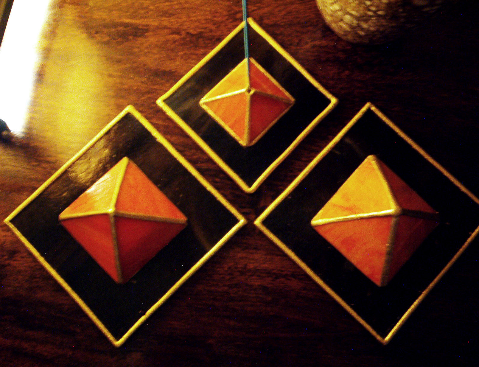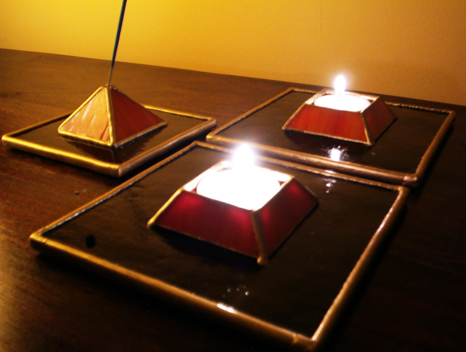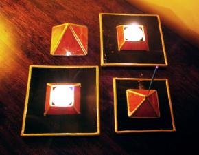 Szimbolikus forma és színek alapján, alul a négyszögletes föld az anyag szimbóluma, rajta a tüzet szimbolizáló piramidion csonka-gúla, tetejét a valódi tűz lángja egészíti ki. Ha visszahelyezzük a piramisra a záróelemét akkor az oxigénhiány hatására finoman elalszik a mécses fénye, míg egy röpke pillanat erejéig átvilágítja a piramis üvegét. Ebben a formájában egy tetszetős asztali dísz, senki sem sejti, mi van alatta-ezért jók a szimbólumok, fel kell fedni őket. Szélein a záróelemek aranyra vannak festve. A piramis négy oldala át van fúrva z üvegen tehát fixen áll, alul a furatok forraszanyaggal kitöltve kis lábakban végződnek így van egy magassága is, a lap picit elemelkedik a földtől.