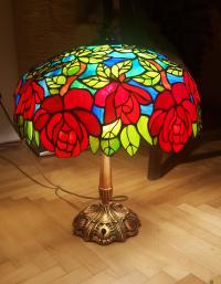 Rendelésre készült részletgazdag, filigrán munka, mely bíbor színben pompázó, szecessziós rózsákat ábrázol dús levélzettel. A bíbor színű üveg, az olajzöld levelek és a türkiz háttérszin csodásan összehangolt üvegválogatás, mely színes fénybe öltöztet minden teret. A szabályosan ismétlődő minták felülről nézve mandala alakot formálnak. 650 darabból álló, saját tervezésű munka. A búra átmérője 40 cm, a lámpa teljes magassága 52 cm.