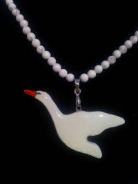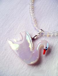 Gyönyörű elegáns, méltóságteljes fehér hattyú, irizált fehér színben ragyogó úszó tünemény, hozzá illő, valódi holdkő-opalit féldrágakő nyaklánccal.