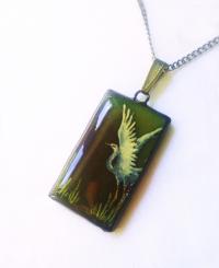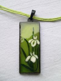 Kellemes, harmonikus zöld háttér-alapra hófehér íriszpárt festettem üvegfestékkel. A felső rétege 3D-s üveglakkal bevont, (a fotón láthatónál az életben domborúbb és csillogóbb). Kedves, bájos, kellemes viselet, hangulata fiatalos és nagyon nőies. Évszaktőól függetlenül viselhető, az örök tavaszt és napfényt idézi.