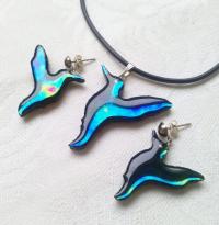 Csodaszép üvegből kifaragott világító kék kolibri medál és fülbevaló enyhe lilás és zöldes színjátékkal. Nagyon finom kivitelezésű akár romantikus akár trendi viseletnek, azoknak, akik szeretik a kéket a madarakat, a dekoratív ékszereket a szépség szerelmeseinek...