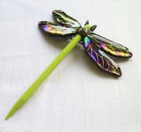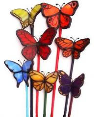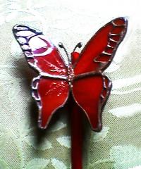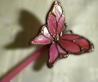 Üvegpálca végén ülő rózsaszín pillangó. Beleszúrhatjuk egy növény vagy csokor virág mellé, de akasztani is lehet damilra, ez esetben az ablakunkban vagy a plafonon röpdösnek szabadon. Kis Csillogással is megspékeltem