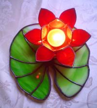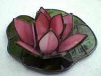 hullámos csillogó lakréteggel bevont zöld levélen. A lótusz nemcsak a tisztaságot és szépséget szimbolizálja, hanem az emberi lélek kibomlását. Azért is övezi olyan nagy tisztelet ezt a virágot, mert növekedésének és fejlődésének körülményei az ideális emberi életutat mutatják be: magja megtelepszik a folyó vagy tómeder alján, majd egy vékony inda indul el belőle, ami egésze a víz felszínéig tekereg, hogy végül a levegőre és napfényre érve kibontsa szirmait így tündöklését nem csak a világ, hanem az istenek is megcsodálhatják. Gyönyörűen átvilágítja a mécses ezt a szép színes üveget, hangulatos dekoráció. Kitűnő ajándék magadnak otthonodnak vagy ismerősödnek. Nagyon szépen mutat még egy asztal közepén vagy polcon, bárhol. Alul kis üveggyöngyök vannak. Lehet kérni irizált - szivárványos felületű üveggel, vagy bármilyen más színben is mind a szirmokat, mind a levelet illetőleg. |