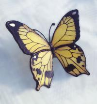 Nagy aprólékossággal és odafigyeléses készült, a napsárga tiffanyüveget kézzel festettem meg, kis lepkepor is van rajta, csillogó üveglakkal bevonva, fixálva. Hű mása az eredeti pillangónak, mely megpihenve a szárnyait eregeti a napfényben, jelen esetben a francia hajcsat ívénél fogva a fej formájához idomul. Ehhez stabilan hozzá van rögzítve a pillangó, forrasztva - ragasztva: ultrabiztos.