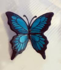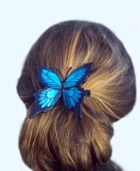 Nagy aprólékossággal és odafigyeléses készült, a kék tiffanyüveget kézzel festettem meg, csillogó üveglakkal bevonva, fixálva. Hű mása az eredeti pillangónak, mely megpihenve a szárnyait eregeti a napfényben, jelen esetben a francia hajcsat ívénél fogva a fej formájához idomul. Ehhez stabilan hozzá van rögzítve a pillangó, forrasztva - ragasztva: ultrabiztos.