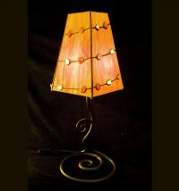 egyedi tervezésű karneol-hegyikristály berakású tiffany asztali lámpa narancs színben, de bármilyen színnel üveggel, egyedi tervezésű búrával, vagy sablont kiválasztva rendelhető. Bárhol szépen mutat, antik jellegű bútorokhoz ugyanúgy illik akárcsak modern környezetbe.Hangulatos sarkot lehet vele kialakítani, mivel gyönyörű meleg fénye van. sajnos e helyett a kovácsoltvas talp helyett csak sima tiffany-talpat tudok hozzá adni |