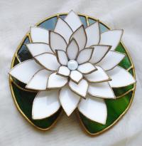Elegáns és szépséges tündérrózsa hófehér szirmokkal, mély zöld színű üveg-levélen arany szélekkel. A lótusz nemcsak a tisztaságot és szépséget szimbolizálja, hanem az emberi lélek kibomlását. Azért is övezi olyan nagy tisztelet ezt a virágot, mert növekedésének és fejlődésének körülményei az ideális emberi életutat mutatják be: magja megtelepszik a folyó vagy tómeder alján, majd egy vékony inda indul el belőle, ami egésze a víz felszínéig tekereg, hogy végül a levegőre és napfényre érve kibontsa szirmait így tündöklését nem csak a világ, hanem az istenek is megcsodálhatják. Gyönyörűen átvilágítja a mécses ezt a szép színes üveget, hangulatos dekoráció. Kitűnő ajándék magadnak otthonodnak vagy ismerősödnek. Nagyon szépen mutat még egy asztal közepén vagy polcon, bárhol. Alul kis üveggyöngyök vannak. Lehet kérni irizált - szivárványos felületű üveggel, vagy bármilyen más színben is mind a szirmokat, mind a levelet illetőleg. |