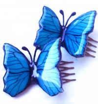 Nagy aprólékossággal és odafigyeléses készült, a kék tiffanyüveget kézzel festettem meg, csillogó üveglakkal bevonva, fixálva. Hű mása az eredeti pillangónak, mely megpihenve a szárnyait eregeti a napfényben, jelen esetben a francia hajcsat ívénél fogva a fej formájához idomul. Ehhez stabilan hozzá van rögzítve a pillangó, forrasztva - ragasztva: ultrabiztos.