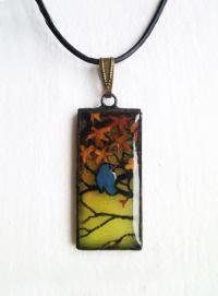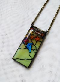 "Zöld erdőben jártam, kék madarat láttam" Világoszöld hátérszín, őszi falevelek egy aprócska, bájos marárral. Az ötletet egy japán tusfestmény adta. Minden részlete kézzel készített, saját tervezésű, időigényes aprólékos kivitelezésű munka. Üvegből faragtam ki, csiszoltam, befoglaltam, forrasztottam, kézzel festettem, 3D-s üveglakkal 2-3x lakoztam. A ráfordított energiával együtt sok szív van benne. Anyaga értékes tiffany üveg, mintája nem fólia, kizárólag ecsetem nyomán született ez kis miniatűr festmény. Különleges viselet, különleges embereknek. Réz lánc alkatrésszel, de kérhető nemesacéllal is. |