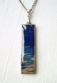 Egyedi színvilágú üvegdarab, melynek különleges színátmenete ezt az űrbéli tájképet juttatta eszembe, melyen a bolygó felszínén gyülekező rózsaszín felhők, a türkizes hajnal és a még csillagos égbolt együttesen látható. az eredetije elkelt, kedvező esetben reprodukálható. Hosszúkás medál, gyönyörű színekkel életteli tájjal, 3 d-üveglakkal domború. Egyedi darab. |
