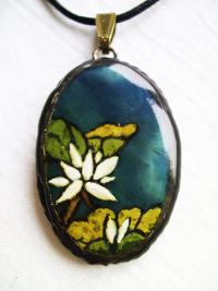 A világ számos kultúrájában a lótusz a legnemesebbnek számító szimbólumok közé tartozik, a lélek szimbóluma a földtől a megvilágosodásig vezető úton. Stilizáltan ábrázolt, kézzel festett, jellegzetesen egyiptomi lótusz irizált rózsaszín alapon, melynek a fényben megtörve kékes csillogása van. Aprólékosan elkészített munka, minden részlete késszel készült, üvegtáblából vágtam ki, csiszoltam, festettem majd 3D-s lakkal kompletten domborúra formáltam, így nyerte el végső formáját. Rendelhető még fehér és kék színben is. Ezüstszín lánc vagy valódi ezüst dukál hozzá, felárral kérésre beszerzem a nemesfémet. |