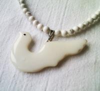 Hófehér üvegből készítettem egy stilizált formájú galambot. Nagyon finom kivitelezésű akár romantikus akár trendi viseletnek, de különösen szép szimbólum is a fehér galamb. Nyakláncként Howlit féldrágakő gyöngyfüzért választottam, így a medál és a nyaklánc egymás szépségét erősítik.